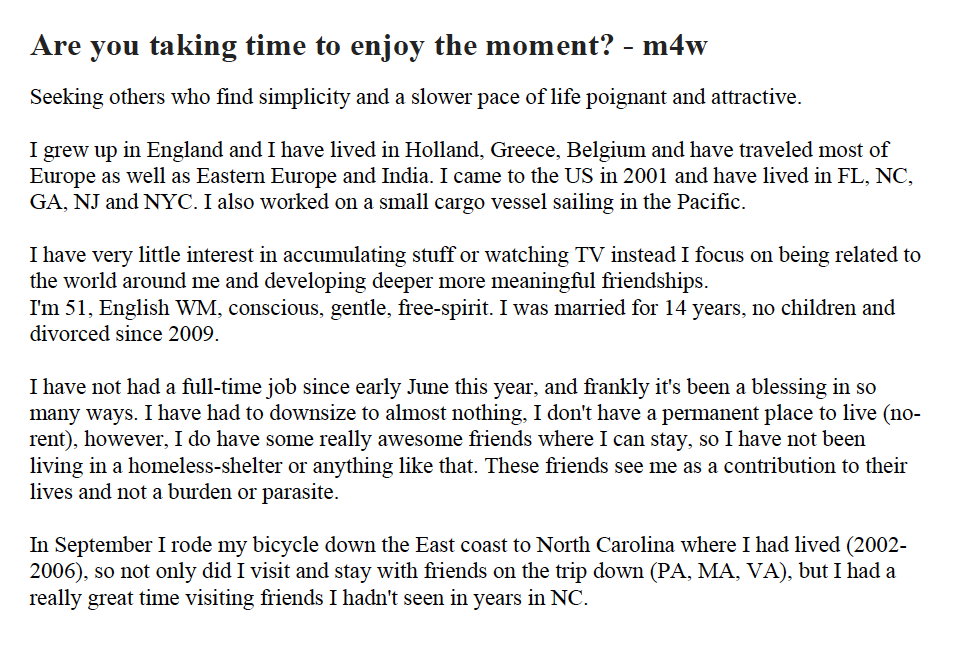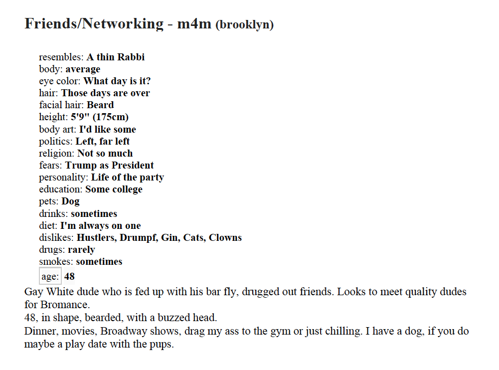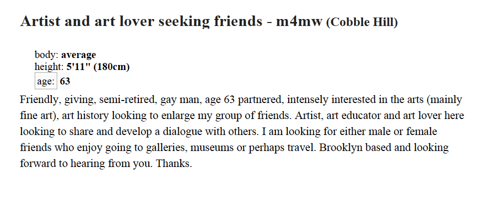 is a project based on personals ads in Craigslist's strictly platonic section.